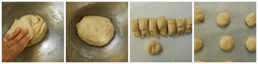 Luego la volcamos en la encimera enharinada y la cortamos en ocho porciones. Formamos con ellas una bolas y las ponemos sobre papel vegetal en una bandeja para horno. Las cubrimos con un paño y dejamos que descansen 20 minutos.