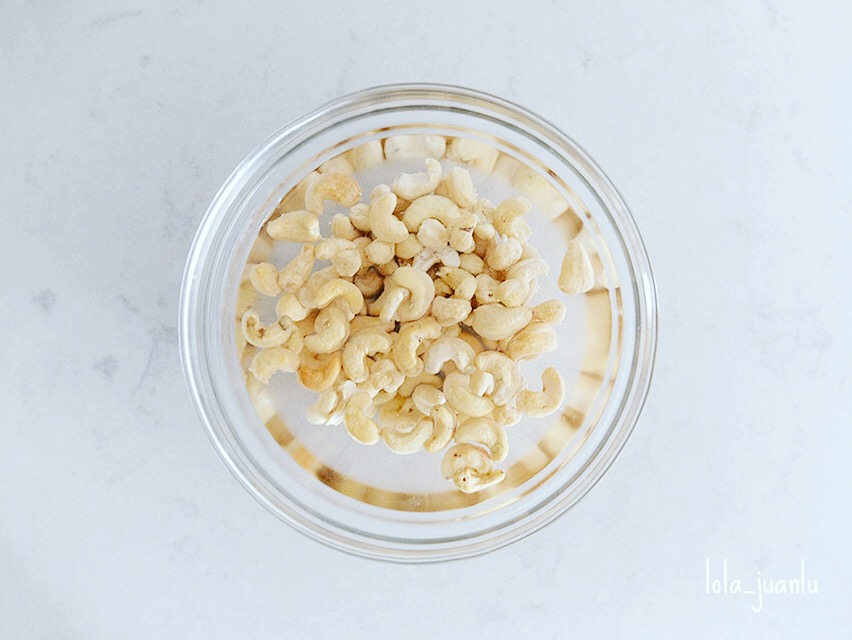 Lo primero que vamos a hacer es poner en remojo los anacardos. Los dejaremos en un bol con agua durante al menos 8 horas. Yo los suelo dejar por la noche antes de acostarme y puedo comenzar a elaborar la receta por la mañana.