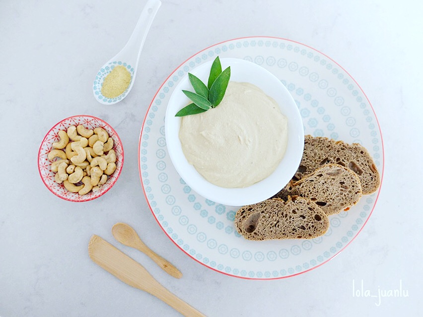 Con ayuda de un colador, escurrimos los anacardos y los introducimos en un baso de una batidora o procesador de alimentos. Añadimos el resto de los ingredientes y batimos hasta conseguir una textura muy fina.