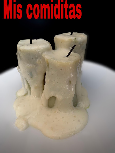 En una sartén hacemos una bechamel como tengamos costumbre. Un poco de aceite de oliva virgen extra o mantequilla, tostamos ligeramente una cucharada de harina e incorporamos leche hasta conseguir una bechamel que o nos quede muy espesa pero tampoco líquida, para que parezca que es la cera derretida de la vela. Salpimentamos y ponemos un poco de nuez moscada.