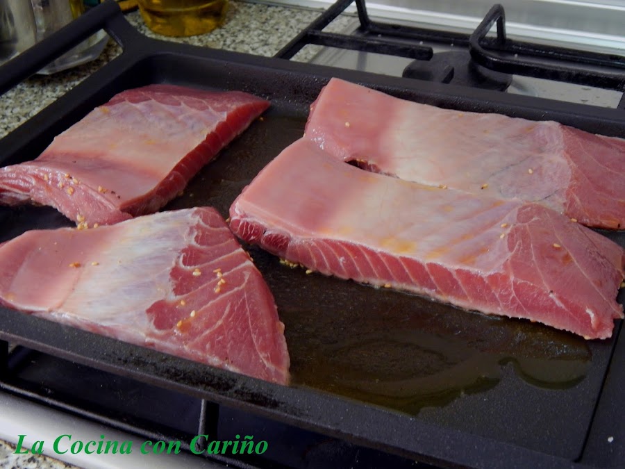 Colocamos la plancha al fuego, medio/fuerte. Salpimentamos el atún y echamos por encima el sésamo, apretando con la palma de la mano. Un chorrito de aceite de oliva virgen extra sobre el atún y colocamos de este lado en la plancha. Dejamos dorar un par de minutos. Volteamos y dejamos otro par de minutos más y,.., la magia vuelve a surgir.