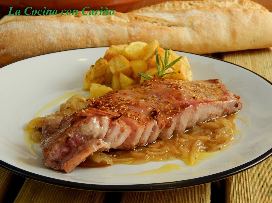 En el plato colocamos una cama de salsa de cebolla y sobre esta, dejamos reposar el atún, un par de minutos antes de comer. Una delicia. Así que, Besos a todas, a todos, Besos a, en fin, muchos besos siempre. Disfrutad.