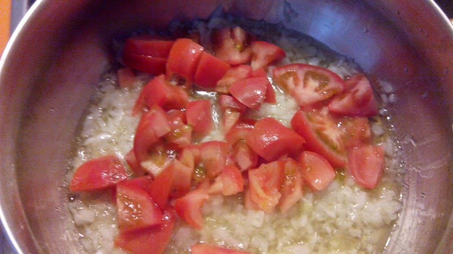 Dejamos cinco minutos y añadimos los tomates a trozos.