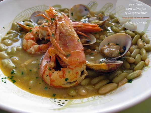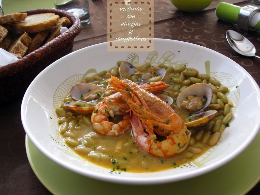 Venían a casa unos amigos que no habían tomado nunca verdinas (ni siquiera las conocían) y aproveche la ocasión ya que es un plato que se puede preparar de víspera y está mucho mejor y así te deja tiempo para preparar el resto de cosas y vas mucho más tranquila. Además es un plato que para una ocasión especial te hace quedar divinamente. Para cocinarlas las estofé sin más y preparé aparte el marisco para luego dejar cocer unos minutos todo el conjunto.