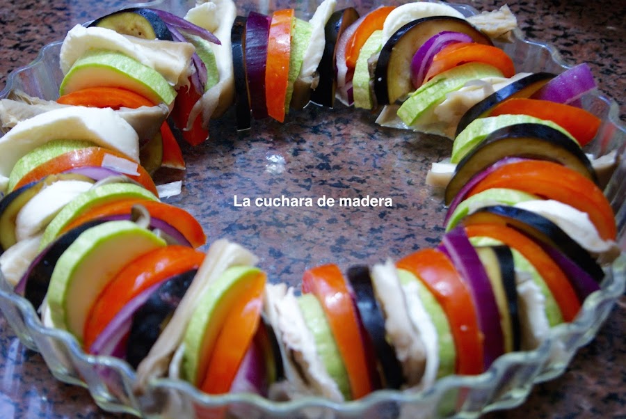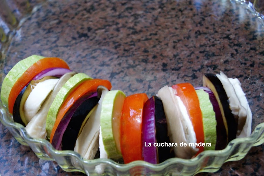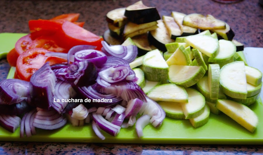 Lavamos toda laverdura, pelamos la cebolla y la cortamos finamente; la berenjena la dejamos con sal gorda unos 10 minutos por uno de los lados para que saque el amargo, después la lavamos y secamos.Cortamos el tomate y el calabacino en rodajas finas.Las rodajas las partimos por la mitad en todas las verduras