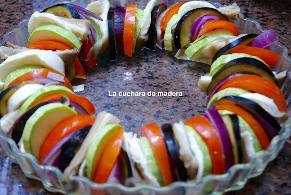 Según vamos poniendo la verdura, apretamos un poco para que nos quepa y no quede flojo el montaje ya que al ir al horno reduce su tamaño. Encendemos el horno a 180 grados