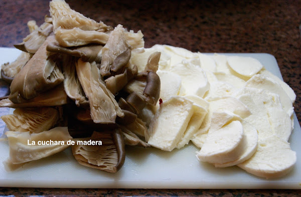Cortamos en rodajas finas la mozzarella y las setas en trozos largos