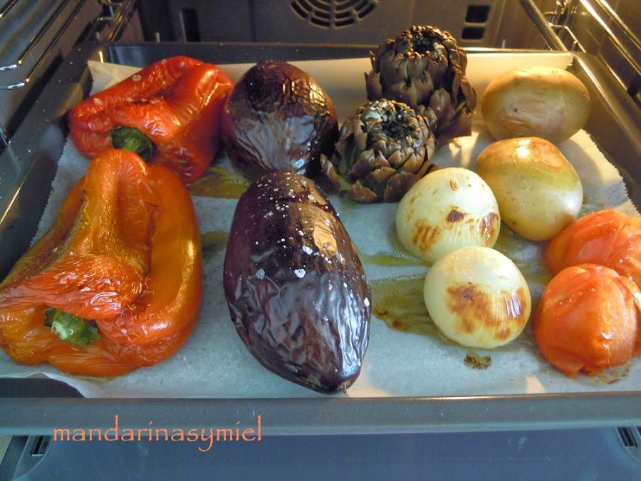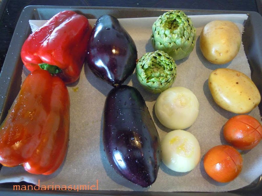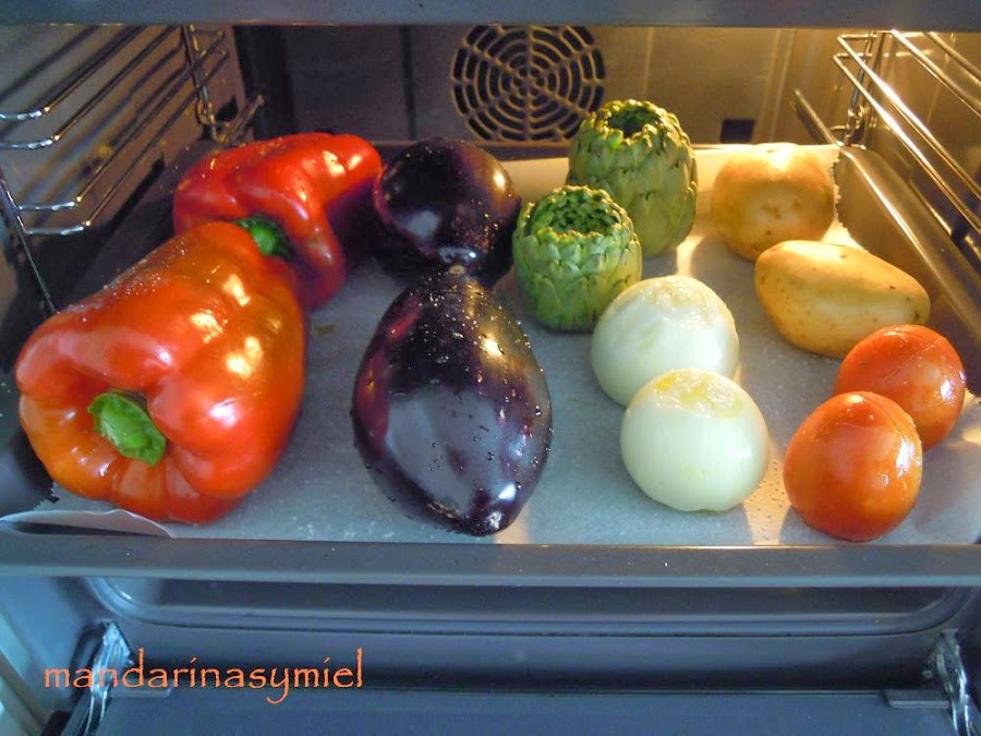 Pon todas las verduras en la bandeja del horno y ponla en el horno a que se asen unos 35 o 40 minutos.