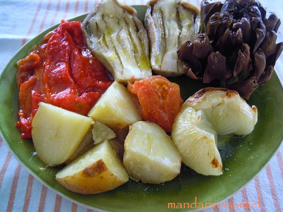 Pela los pimientos y córtalos a tiras, pela las berenjenas, los tomates y parte las patatas a trozos. Pon sal y aceite y a comer.