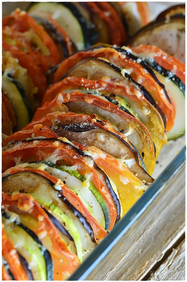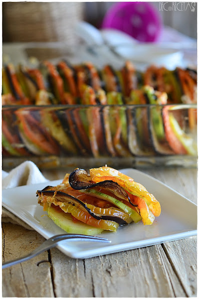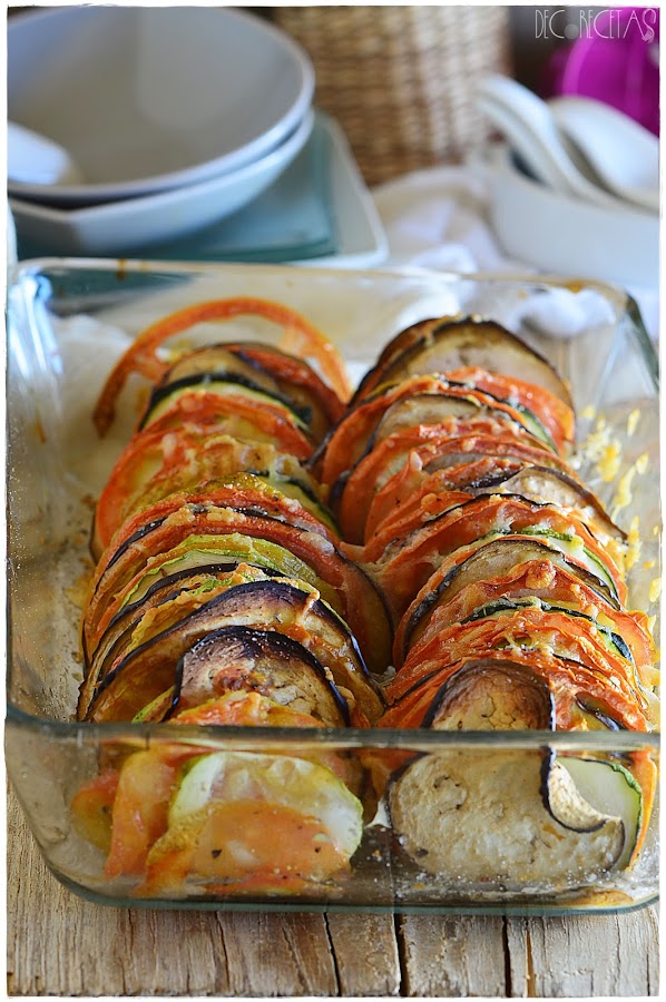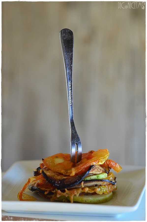 Si tenéis una mandolina, menos tiempo perderéis en la cocina partiendo las verduras, En este caso yo corté con el mismo grosor calabacin, berenjena y tomate y espolvoreando queso mozzarella rallado por encima con sal, pimienta y un hilo de aceite, introducí en el horno directamente a 180 grados con calor arriba y abajo, durante 30 minutos