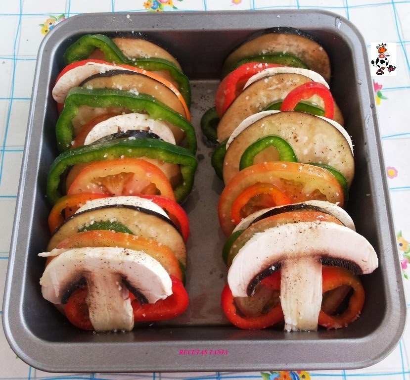 Cortamos en rodajas la berenjena y la ponemos un plato con sal,una media hora. Cortamos en rodajas los pimientos,el tomate y picamos los champiñones en láminas. En una banjeda de horno ponemos un chorrito de aceite de oliva y colocamos las verduras en fila,ponemos un chorrito de aceite,añadimos sal y metemos al horno unos 30-35min a 220. Sacamos las verduras, emplatamos y espolvoreamos perejil picadito.