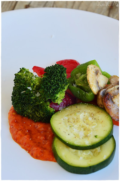 Las verduras las de vuestra preferencia, en mi caso brócoli, calabacín, pimiento rojo y verde, zanahoria y champiñones. Os recomiendo que sal pimienta y las verduras aunque añadáis la salsa