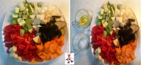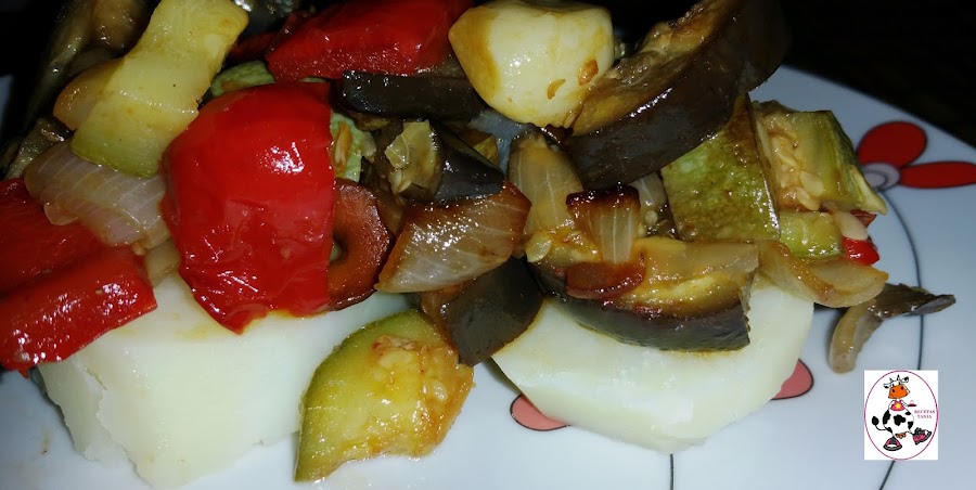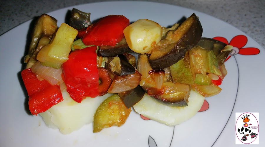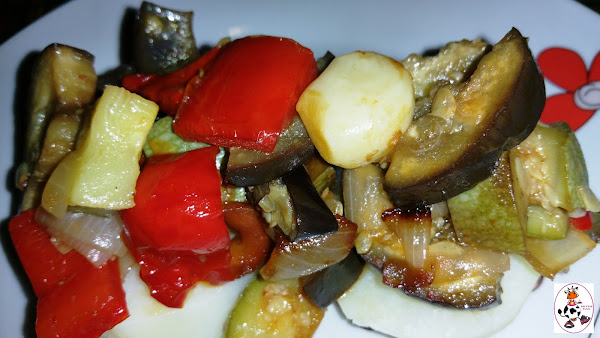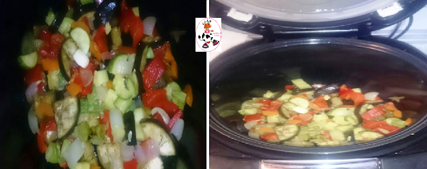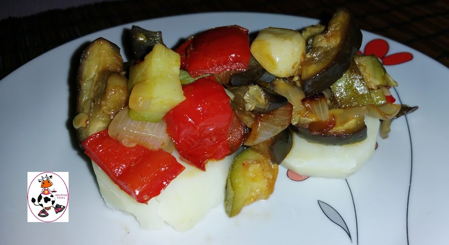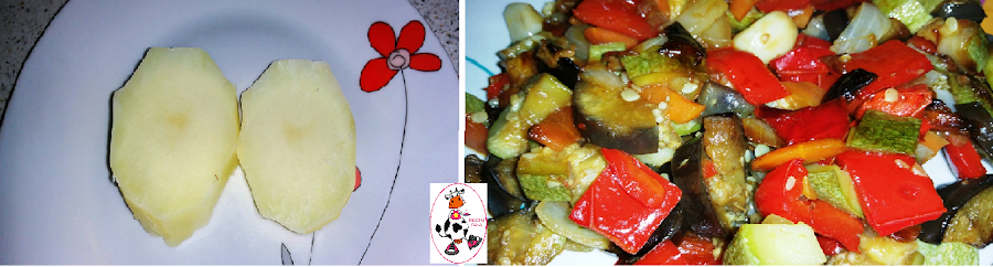 Ponemos el programa "FRY" tiempo de preparación 25min. Cocinamos hasta final del programa. Mientras se están haciendo las verduras en un caldero con agua y un poco de sal ponemos una papa (patata) pelada y lavada a cocer. Cuando esté tierna la sacamos y cortamos unas rodajas y las ponemos en un plato para poder poner las verduras asadas encima.