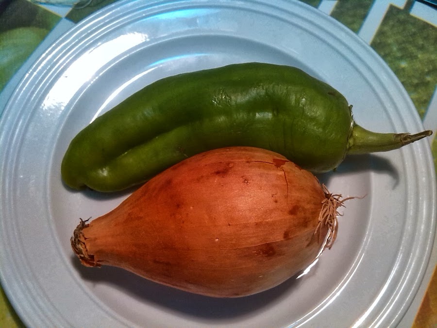 Y lo que tenía en casa era, una bolsa de congelado de menestra de verduras ( que contiene judías redondas, guisantes, zanahorias, coles de Bruselas, alcachofas y habas), cebollas, pimientos y plátanos canarios.
