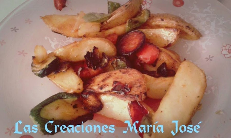 Se limpian las verduras y se cortan en cachos, se hacen en la plancha junto con el chorizo en rodajas. Mientras de limpian las patatas y sin pelar se cortan en gajos, se fríen. De que este todo echo se reparte en platos se fríen los huevos y se pone un huevo (o los que queráis) en cada plato, se rompe, se mezcla y a comer. Rico rico.