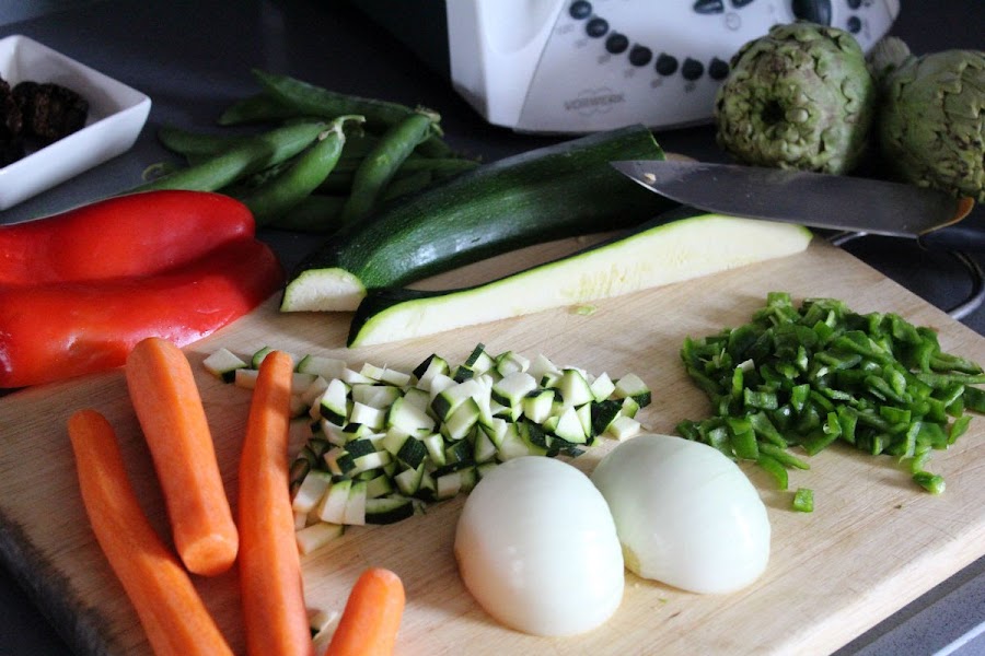 Vamos picando los pimientos, la cebolla y el calabacín.