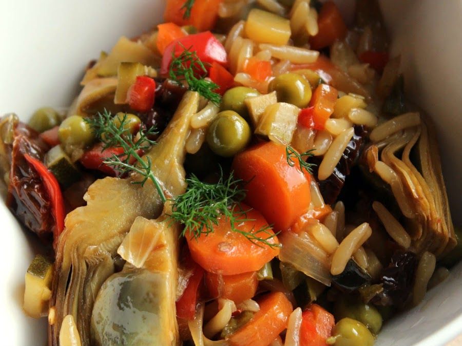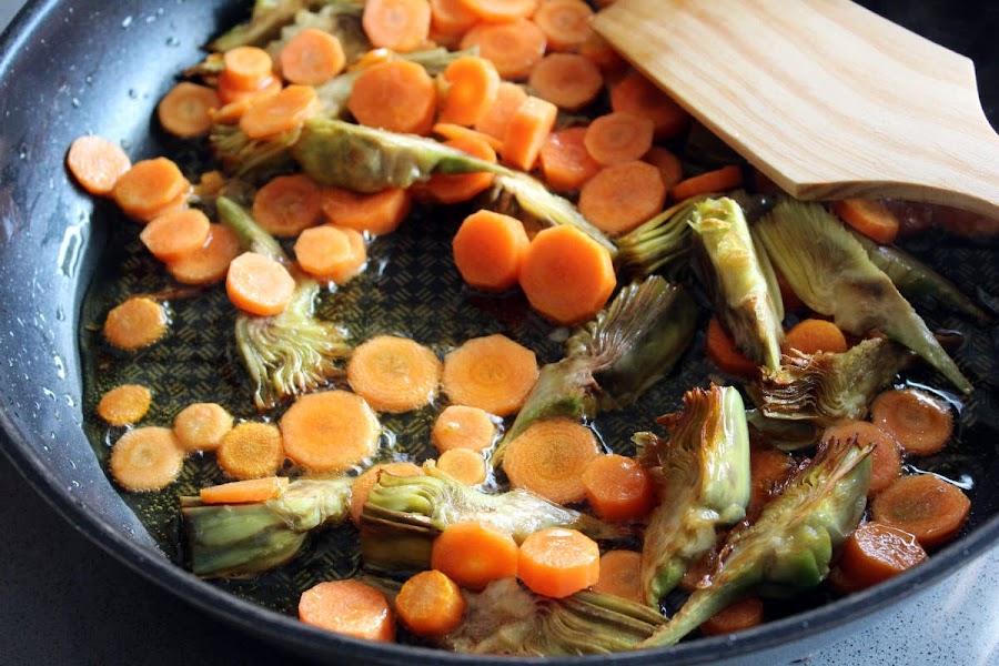 En una sartén grande, ponemos aceite y comenzamos friendo las alcachofas y las zanahorias, limpias y troceadas.Freimos las alcachofas, unos 8 minutos. Añadimos la zanahoria en rodajas.