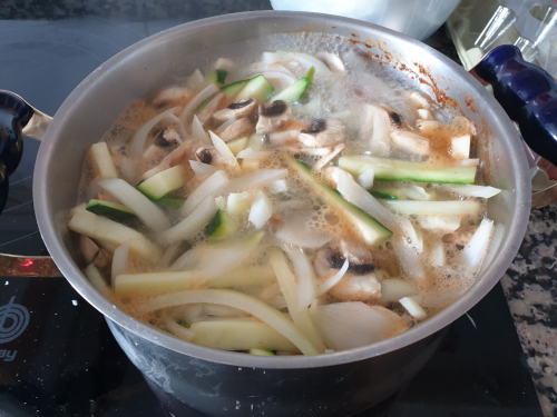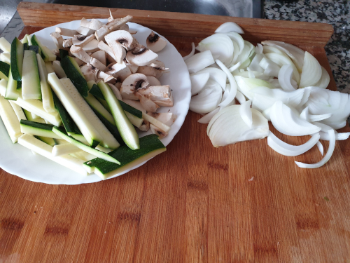Añadimos los champiñones, la cebolla y el calabacín.