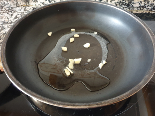 - En una sartén ponemos un poco de aceite de oliva y cuando esté caliente añadimos el ajo.