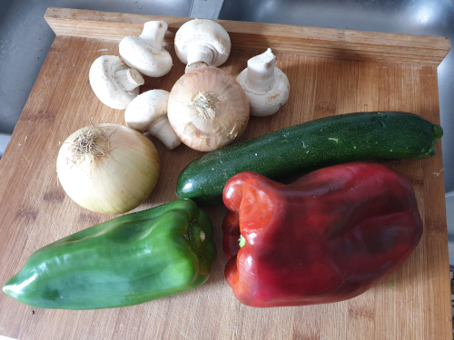 - Lavamos el calabacín y los pimientos y los cortamos en palitos, reservamos.