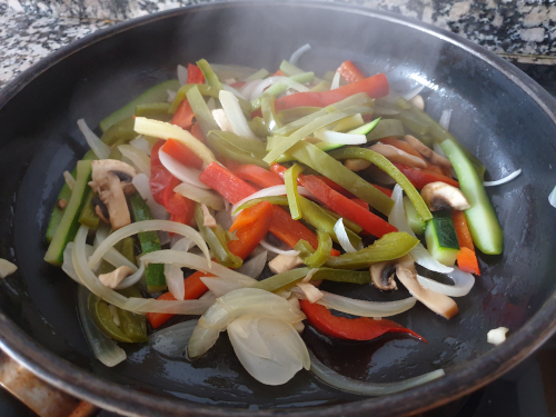 Cuando comience a dorarse añadimos el resto de verduras y la salsa de soja.