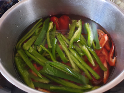 - En un cazo ponemos agua a ebullición y cuando empiece a hervir, añadimos los pimientos, que los cocinamos 2 minutos.