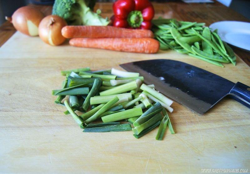 Como un wok es fabricado para cocinar hasta 2-3 raciones a la vez, vamos a cocinar nuestras verduras en 2 tandas, pero primero preparamos las verduras cortando las cebollas en juliana, las zanahorias en bastones, el pimiento rojo en tiras y cocemos el brócoli cortado sumergiéndolo en agua hirviendo durante 2 o 3 minutos, luego lo escurrimos bien y lo tenemos a mano.Así también colocamos nuestras verduras cerca del wok que puesto con el aceite vegetal a fuego fuerte estará listo cuando empiece a humear para saltear las verduras.