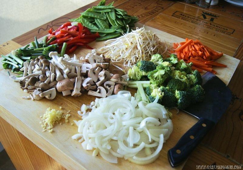 1. Como un wok es fabricado para cocinar hasta 2-3 raciones a la vez, vamos a cocinar nuestras verduras en 2 tandas, pero primero preparamos las verduras cortando las cebollas en juliana, las zanahorias en bastones, el pimiento rojo en tiras y cocemos el brócoli cortado sumergiéndolo en agua hirviendo durante 2 o 3 minutos, luego lo escurrimos bien y lo tenemos a mano.2. Así también colocamos nuestras verduras cerca del wok que puesto con el aceite vegetal a fuego fuerte estará listo cuando empiece a humear para saltear las verduras.