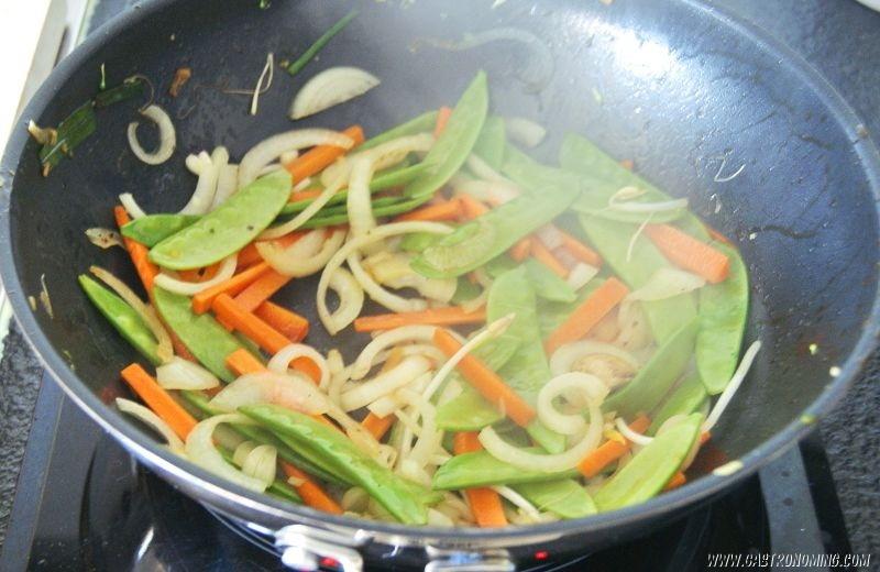 Lo primero que añadiremos al wok serán las cebollas con el jengibre picado, las zanahorias y los tirabeques para saltearlos enérgicamente sin dejar de mover.