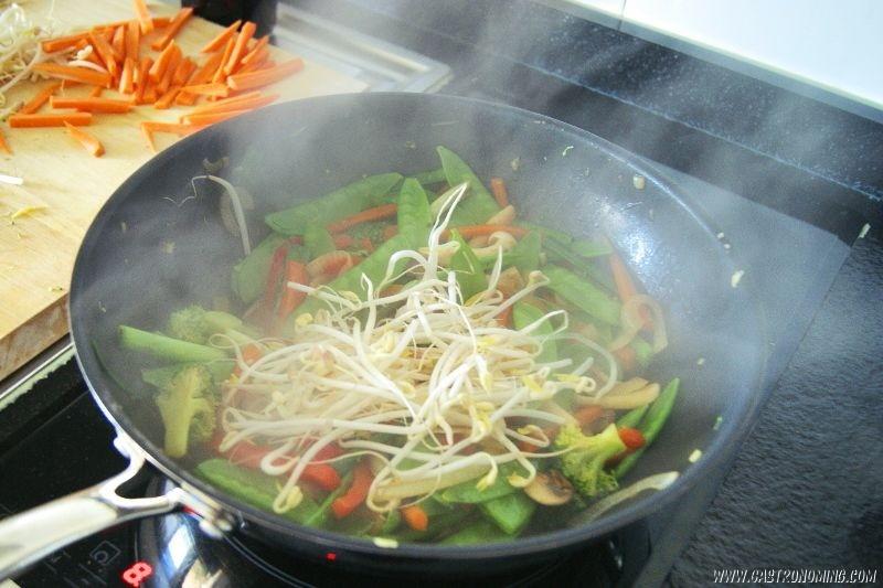 6. Para terminar, echamos al wok los brotes de soja, salteamos y servimos inmediatamente acompañando con arroz blanco cocido.