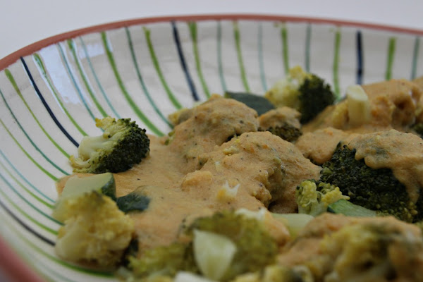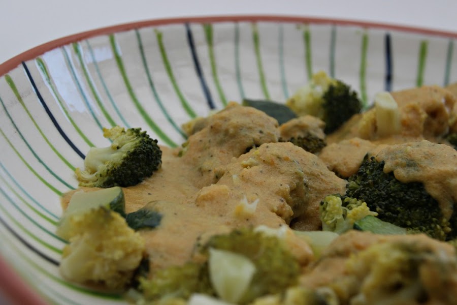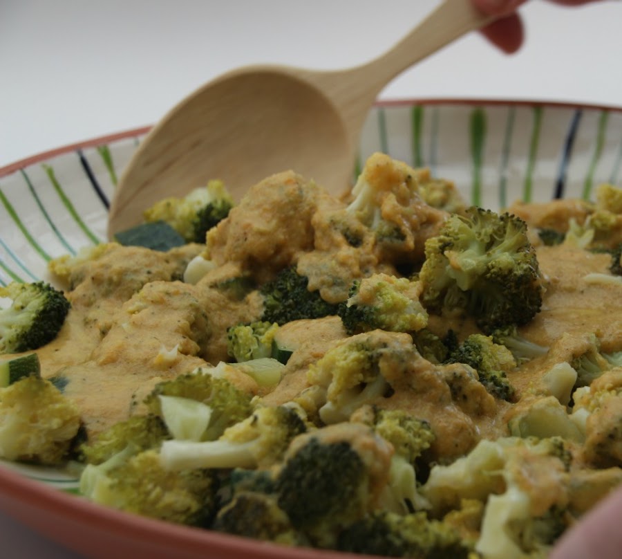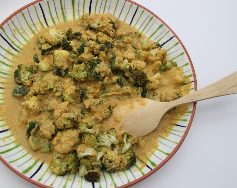 Reservamos las verduras en una fuente amplia. Añadimos el curry al vaso y programamos: