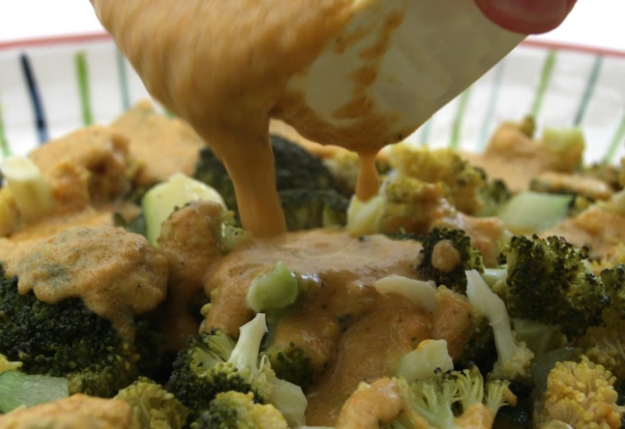 Vertemos sobre las verduras la salsa, bien caliente.