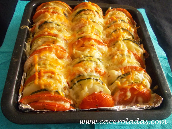 Pondremos una rodaja de patatas, otra de tomate, de calabacín amarillo, de cebolla, de calabacín verde y así haremos filas con todas las verduras.