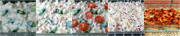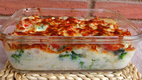 He usado verduras como brócoli, coliflor y también tomates cherry. Aquí se combinan fibra, antioxidantes, vitaminas A y B, potasio y otros minerales. Son todas muy buenas para una alimentación baja en calorías, pues son bajas en grasas y favorecen la eliminación de líquidos. La salsa bechamel sube un poco las calorías, pero no deja de ser saludable. En una alimentación balanceada debemos comer de todo, incluyendo grasas y carbohidratos, con moderación.