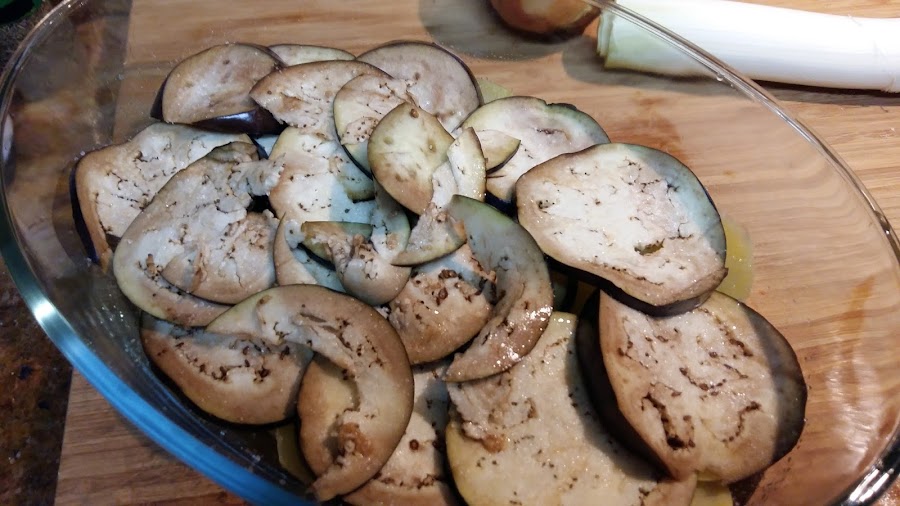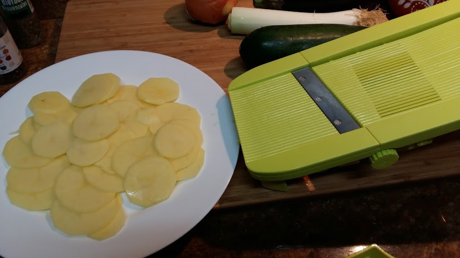 Yo he usado una mandolina para cortarlo todo y que queden las rodajas del mismo tamaño, si no tienes, usa el cuchillo. Tardarás un poco más pero queda igual de bien.