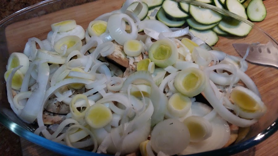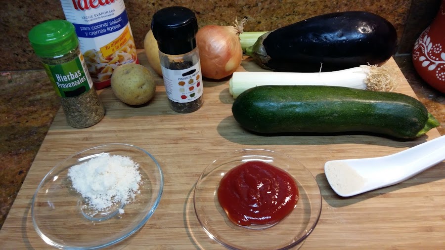 2 patatas, 1 berenjena grande, 2 calabacines, 1 cebolla, 2 puerros, 100 ml de leche evaporada, 3 cucharadas de salsa de tomate, 1 cucharada de queso rallado bajo en grasa, 1 cucharada de pan rallado, hierbas provenzales, unas gotas de aceite, sal y pimienta