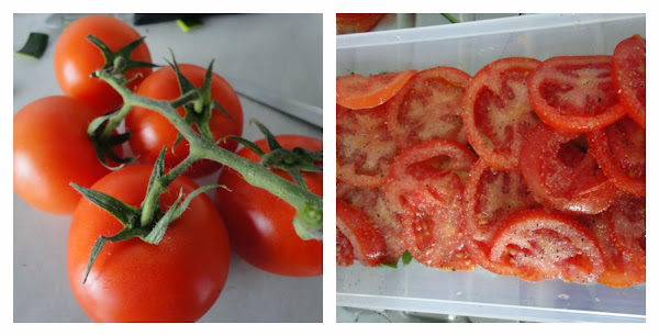 Colocamos los tomates sobre el calabacín y repetimos la acción: sal, azúcar, pimienta y perejil.