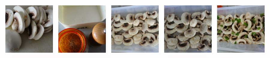 Colocamos los champiñones en un táper y los rociamos con sal, azúcar moreno, pimienta negra recién molida y perejil cortado de una manera grosera.