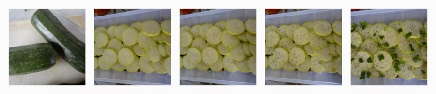 Seguimos pelando el calabacín y cortándolo en rodajas no demasiado gruesas (1/2 cm). Colocamos las rodajas de calabacín sobre los champiñones y, de nuevo, las espolvoreamos con sal, azúcar moreno, pimienta negra y perejil picado.