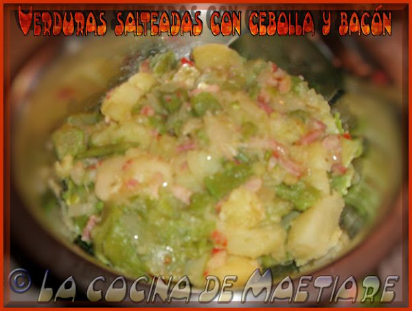 Escurrimos la verdura y en la misma cacerola, poner un poco de aceite ( en mi caso un poco de aceite que usé para freír alas de pollo) y saltear el ajo picado y antes de que dore añadir la cebolla, Saltear a fuego medio hasta que comience a transparentar. En éste momento añadir el bacón ahumado y seguir salteando hasta que el bacón comience también a transparentar y hayan soltado un poco de su grasa.