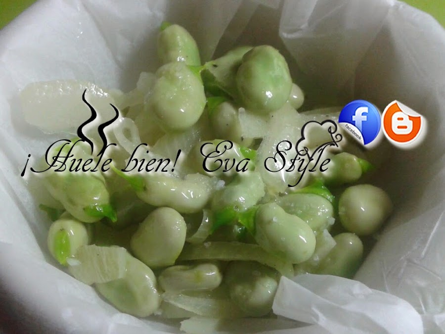 2.- Pelamos la cebolla y la partimos en juliana. Pelamos y picamos los ajos. Calentamos una cuchara de aceite en una sartén. Salteamos el ajo durante unos segundos. Agregamos la cebolla y rehogamos unos minutos. Apartamos del fuego y añadimos las habitas lavadas y secadas.