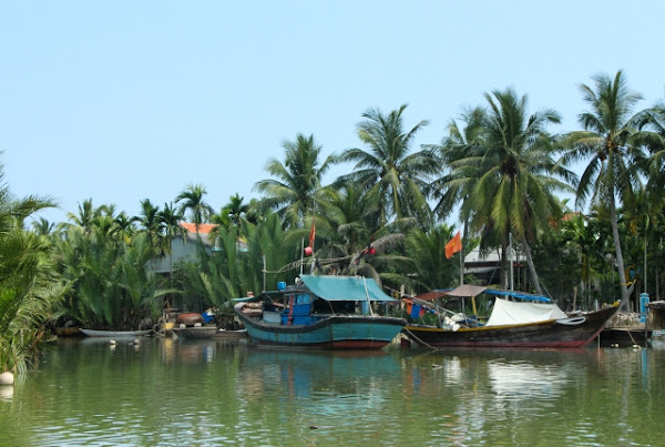 Para llegar a la clase de cocina nos subieron a un lindo bote hasta llegar a un estrecho canal con plantaciones de coco bajo el agua, aquí nos cambiamos a un bote más pequeño y nos pasaron los típicos gorritos vietnamitas para protegernos del sol.