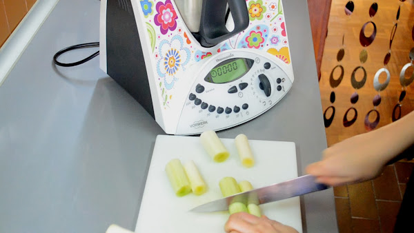 Introduce los puerros troceados y la cebolla en cuartos en el vaso de la thermomix.