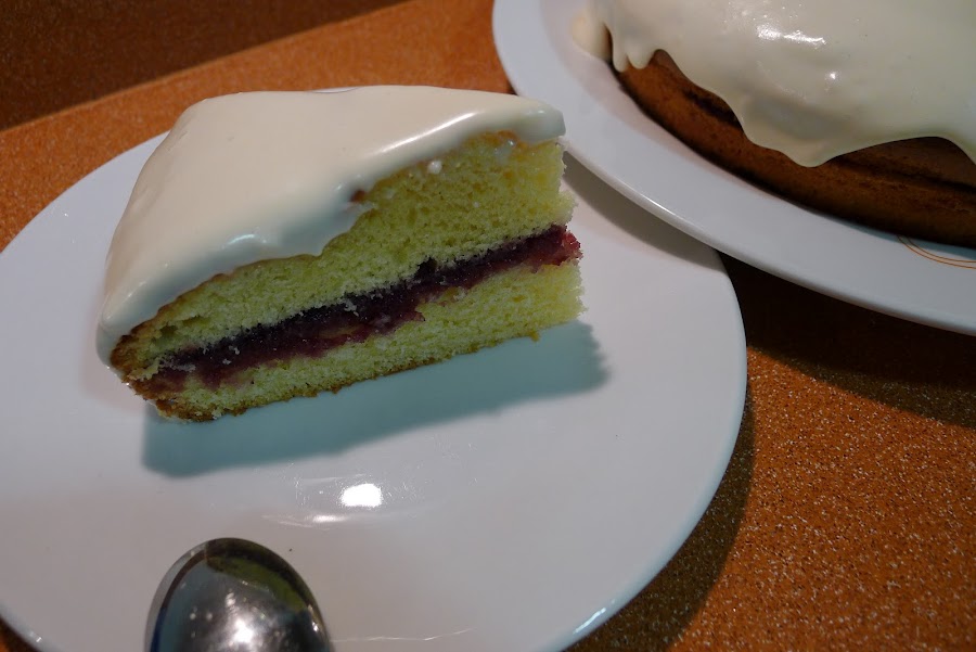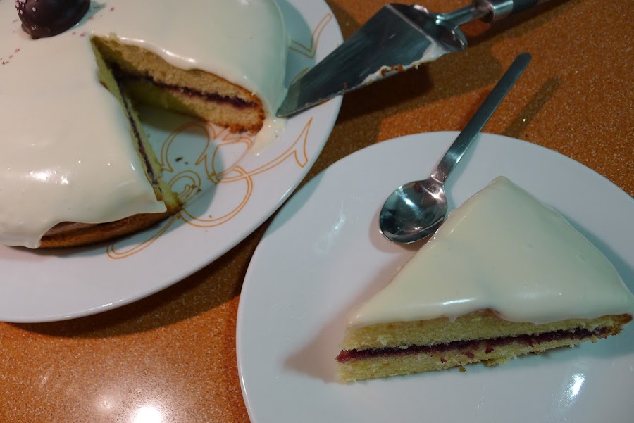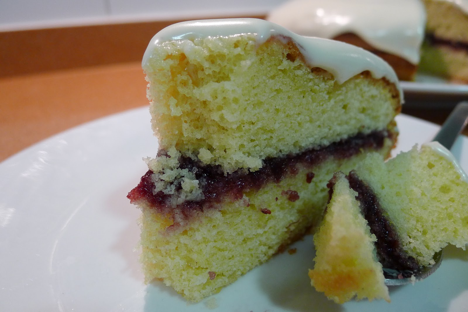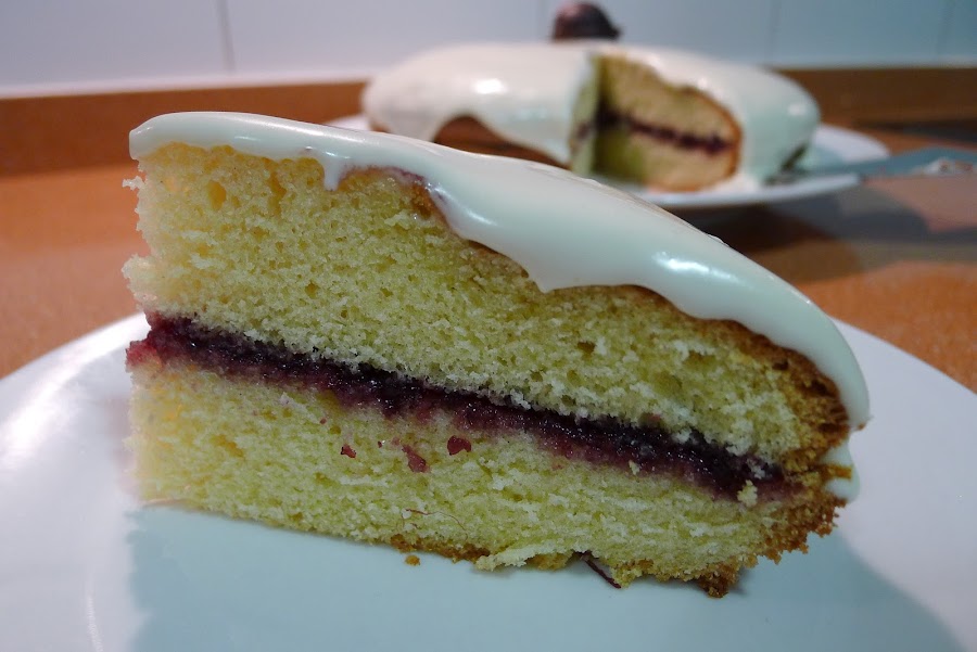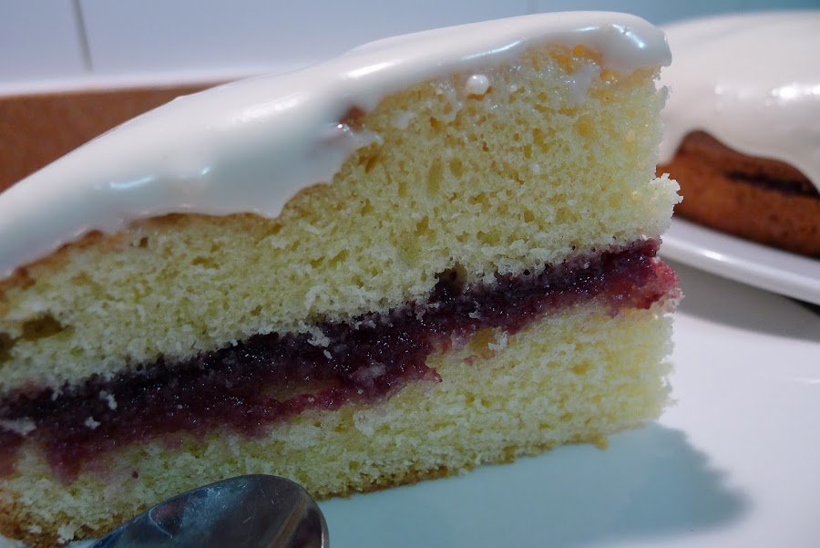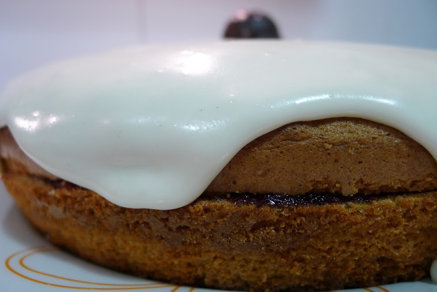 Una vez se haya enfriado completamente,cortamos con cuidado el bizcocho en dos mitades y lo rellenamos con la mermelada,tapamos con la otra mitad.