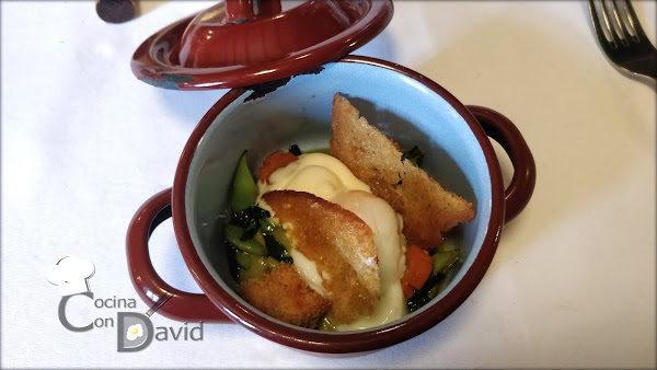 Finalizamos los entrantes con "El terruño". Te presentan una cazuelita en la que te aconsejan abrir, romper y mezclar todo. Dentro encontramos de fondo una crema de guisantes suave, una muselina ácida, judías, zanahoria, el huevo poche y el toque crujiente del pan frito. Una mezcla de sabores muy rica, que cada ingrediente aporta una cosa y todo ello hace un plato muy bueno, como si se tratase de una menestra de verduras diferente.