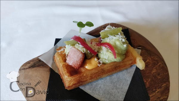 Gofre salado, guacamole, panceta ibérica, queso de Rodiquero.