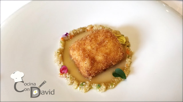 Empezamos con el primer plato llamado "Confort". Se trata de una croqueta de leche de oveja super cremosa por dentro y crujiente por fuera, posada sobre una veloute de caldo de pollo muy suave, brotes frescos y rodeada de quinoa. Me encantó, una croqueta muy buena, cremosa y suave a pesar de ser de leche de oveja, la mezcla del sabor de pollo con la croqueta y la quinoa hace que sea un platazo.