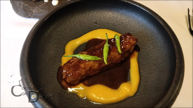 Seguimos con "La cuchara y los ajillos". Un guiso de verdinas y habitas de su propia huerta, cremosas y con un toque picante, acompañadas de una gyoza crujiente y melosa de pato y berenjena y coronado con Katsuobushi. Un plato muy rico, mezcla de sabores, tradicional con el toque asiático. Sabores que casan muy bien y te hacen entrar en calor. Muy rico.