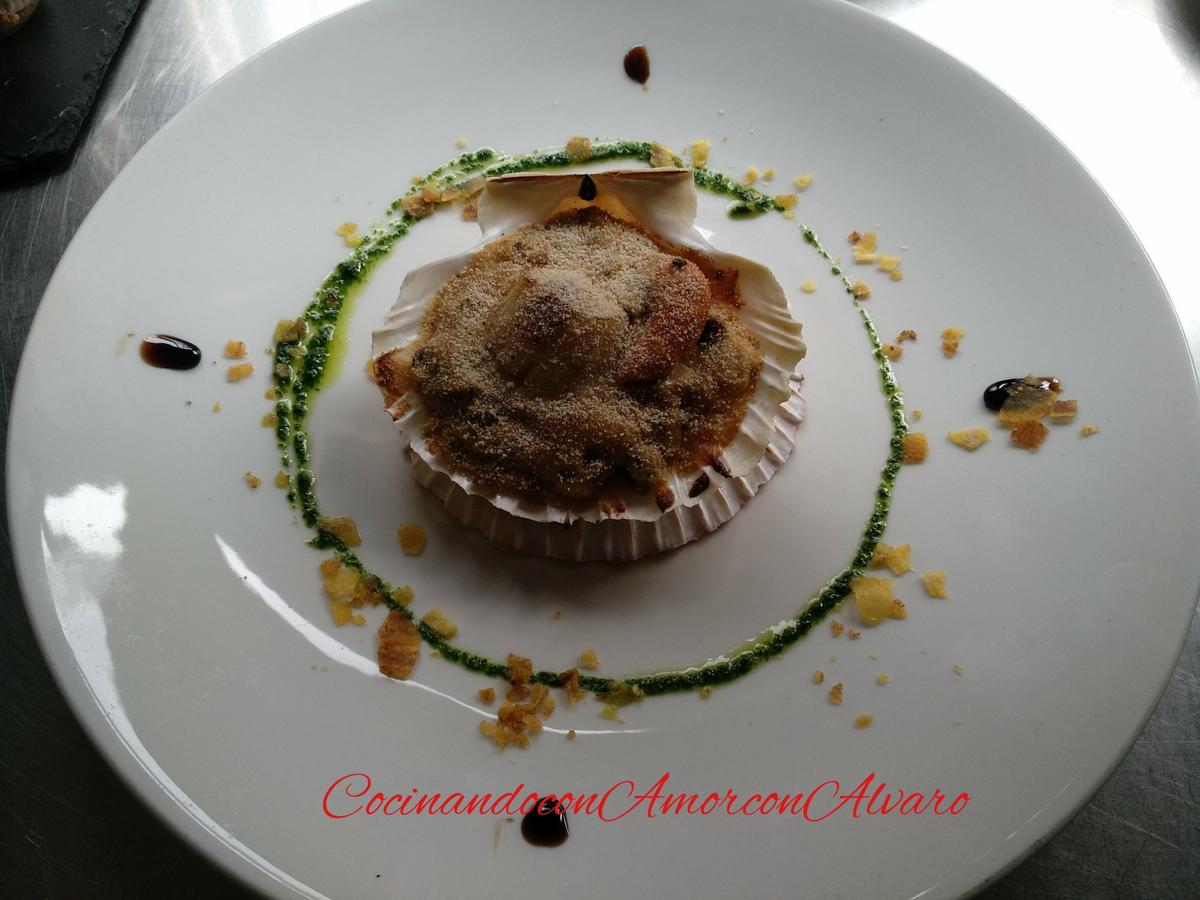 Rociamos la superficie con pan rallado, la capa de pan rallado gratinada, mantendrá todos sus jugos y sabor a mar de las vieiras.