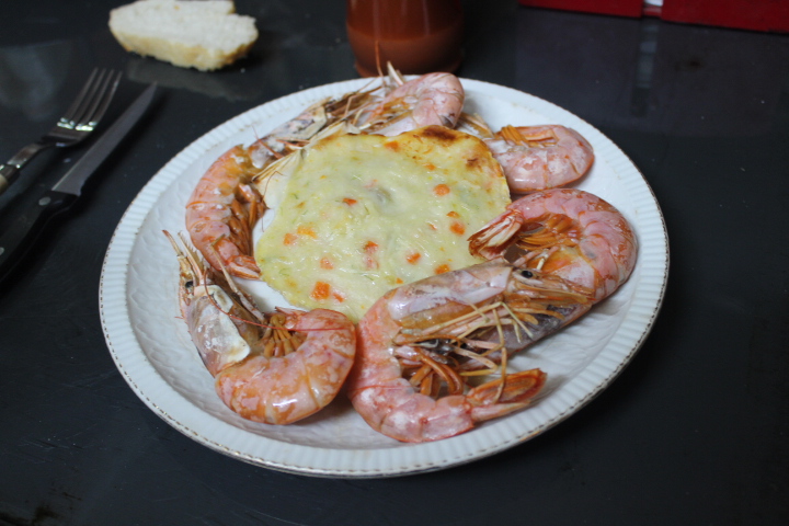 Sacamos las gambas y las vieiras del congelador un rato antes (15-30 minutos), para que se atemperen, pero sin que lleguen a descongelarse, así quedarán las gambas más jugosas.